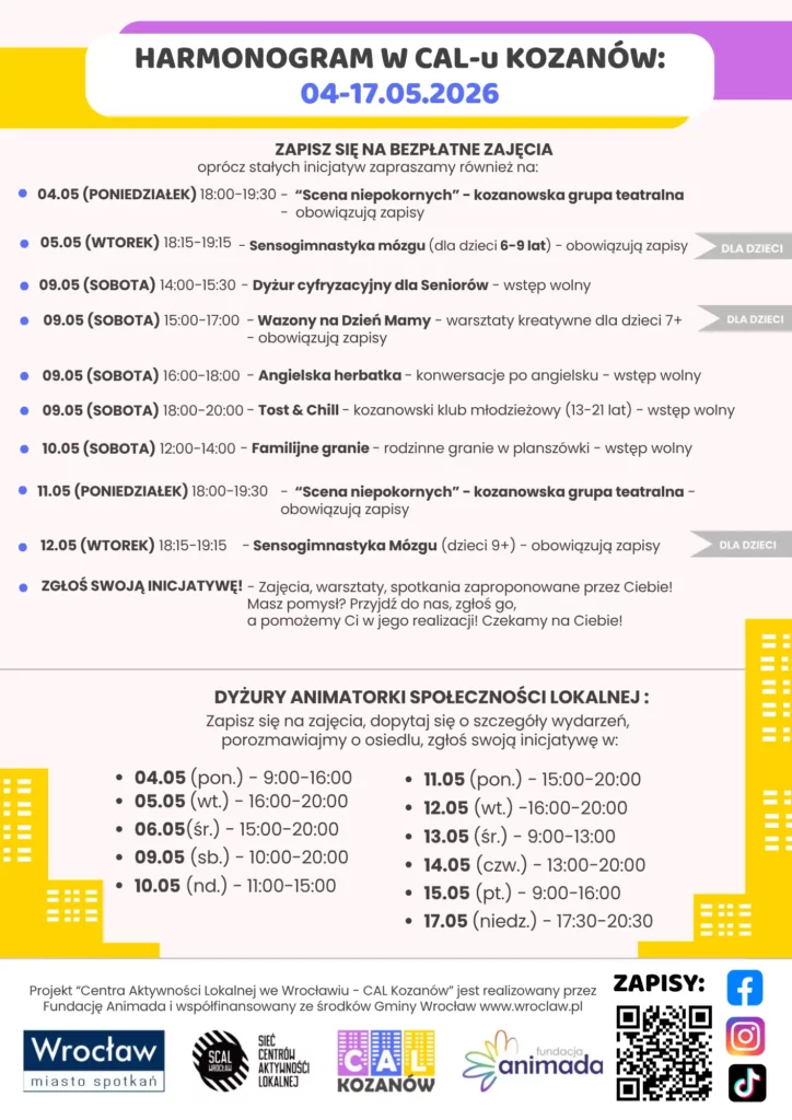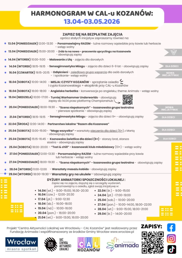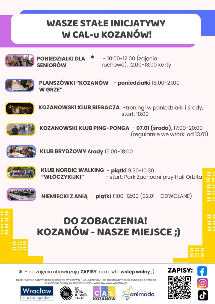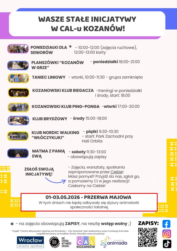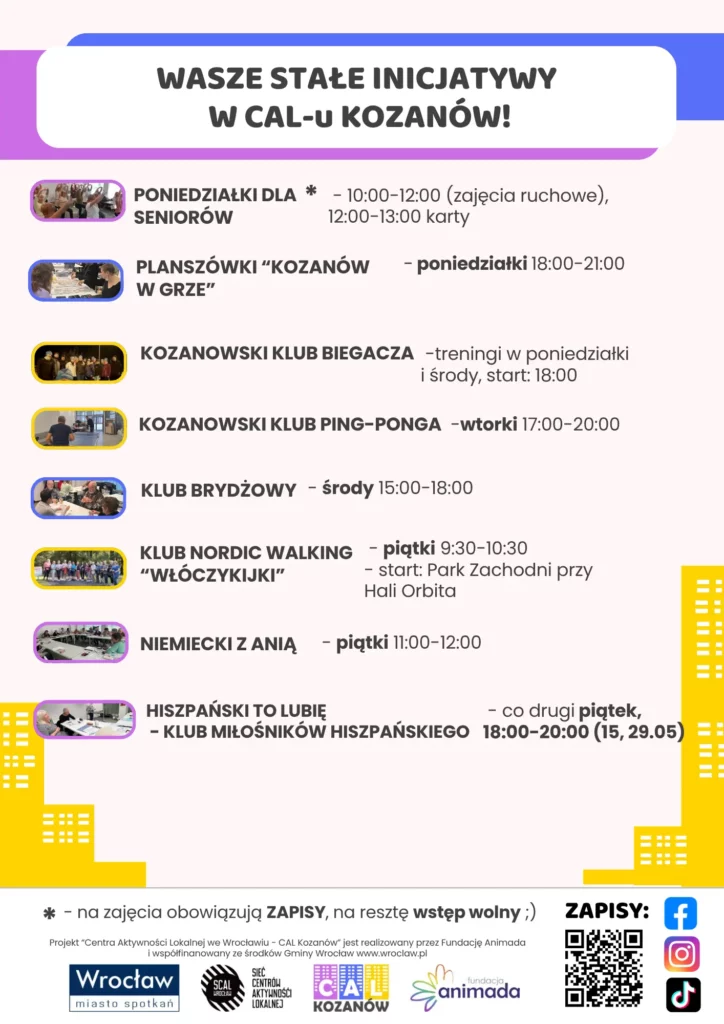 Z inicjatyw Mieszkańców powstało już wiele działań – m.in.: klub planszówkowy „Kozanów w Grze”, Kozanowski Klub Biegacza, Klub Brydżowy, Poniedziałki dla Seniorów, Samoobrona, „Matma inaczej niż w szkole”, Angielskie konwersacje i wiele więcej, a następne może być TWOJE!