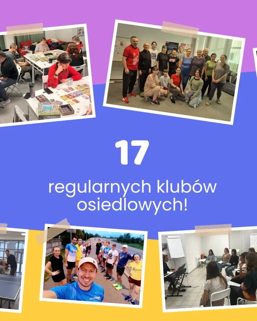 👉 regularnie działało 17 klubów osiedlowych (m.in.: klub planszówkowy, klub brydżowy, angielskie konwersacje, j. Angielski, j. Niemiecki, klub pingponga, Kozanowski Klub Biegacza, Szydelkowanie, Scrabble i wiele więcej!)