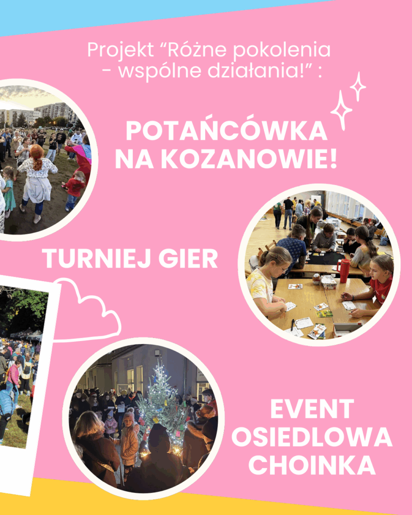 👉 wspieraliśmy projekt „Różne pokolenia – wspólne działania”, w ramach którego zorganizowaliśmy: międzypokoleniową potańcówkę na Kozanowie, międzypokoleniowy turniej gier oraz wydarzenie „Różne pokolenia – wspólna choinka”